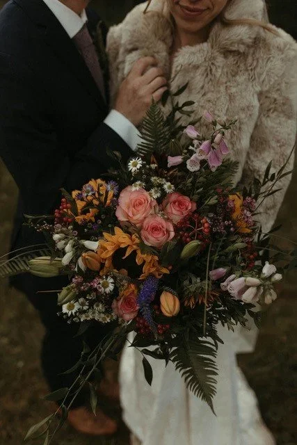 “Dani was incredible to work with! From the first email, she was so communicative and responsive. She made it simple to plan and bring my ideas to life. I gave her some inspiration photos as well as the colour of the bridesmaids dresses and she created the most stunning bouquet and centrepieces that matched the vibe I had envisioned. We had so many compliments on the flowers specifically the Fiesta Roses! I had never seen these before but Dani had reached out before the wedding day to have me approve them and they did not disappoint. I would highly recommend working with Dani for unique florals that are the perfect addition to your wedding day.”